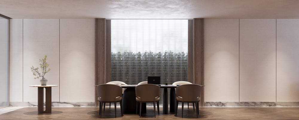 แกนของงานออกแบบคือการจัดโปรแกรมพื้นที่ให้สมดุลระหว่างความเป็นส่วนตัวและความเป็นสังคม เราจึงวาง “โซนเอนกประสงค์” ไว้ฝั่งซ้ายของบ้าน แบ่งเป็น 2 ส่วนหลัก: มุมรับรองแขก และพื้นที่ประชุม/ทำงาน เพื่อให้เจ้าของบ้านใช้ชีวิตได้ครบทั้งพักผ่อนและทำงาน โดยไม่รู้สึกว่าพื้นที่ทับซ้อนกันเกินไป