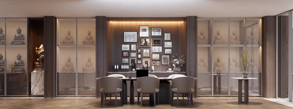 เส้นแบ่งพื้นที่ถูกทำให้ “บางเบา” ด้วยบานเลื่อนกระจกใส จุดเด่น คือเมื่อถึงเวลาจัดงานเลี้ยงหรือรวมตัว กระจกสามารถเลื่อนซ่อนเข้าไปในผนังได้อย่างแนบเนียน ทำให้พื้นที่ที่เคยแยกออก กลายเป็นห้องเดียวที่ต่อเนื่อง เปิดบรรยากาศกว้างขวางและเป็นกันเองทันที