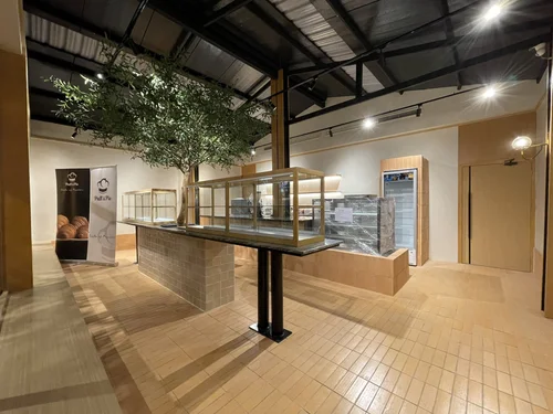 ภายในร้านเลือกใช้โถงสูงและโครงหลังคาโชว์โครงสร้างสีเข้ม แล้วเติมแสงธรรมชาติจากสกายไลท์ ทำให้พื้นที่โปร่ง สว่าง และมีอารมณ์ตลอดวัน จุดโฟกัสหลักคือเคาน์เตอร์/ตู้โชว์ที่จัดวางกลางร้าน เพื่อให้ลูกค้าเห็นสินค้าและเดินเลือกได้เป็นธรรมชาติ