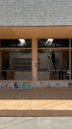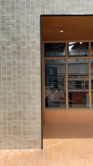 ภาพรวมของงานคุมโทนให้อยู่ในกลุ่มสีอบอุ่นและวัสดุที่สัมผัสได้จริง ฟาซาดกระเบื้องโทนเบจช่วยให้ร้านดูสะอาดและนิ่ง ขณะที่กรอบไม้ของช่องเปิดลึกเพิ่มมิติให้ด้านหน้า และทำให้จุดนั่งหน้าร้านดูเป็นมุมพักเล็ก ๆ ที่ใช้งานได้จริง