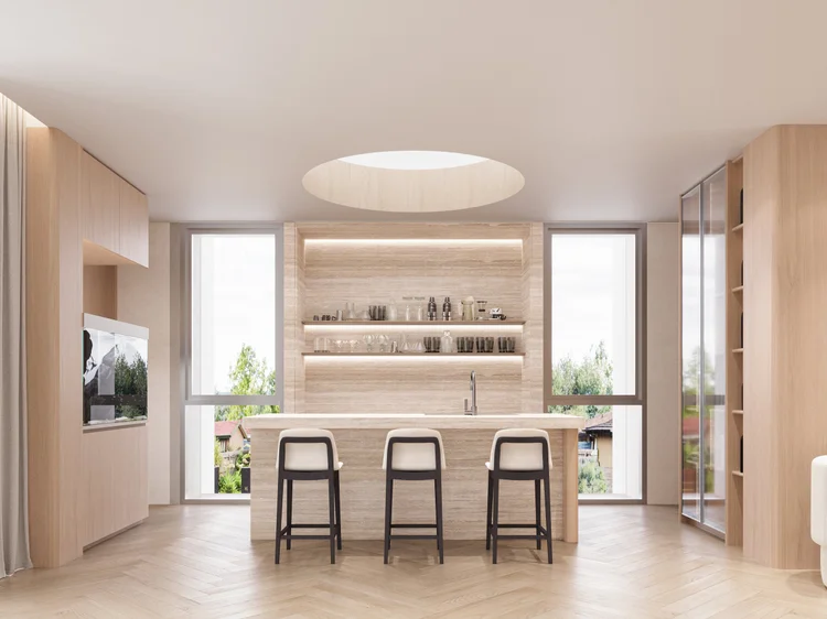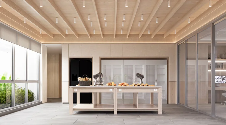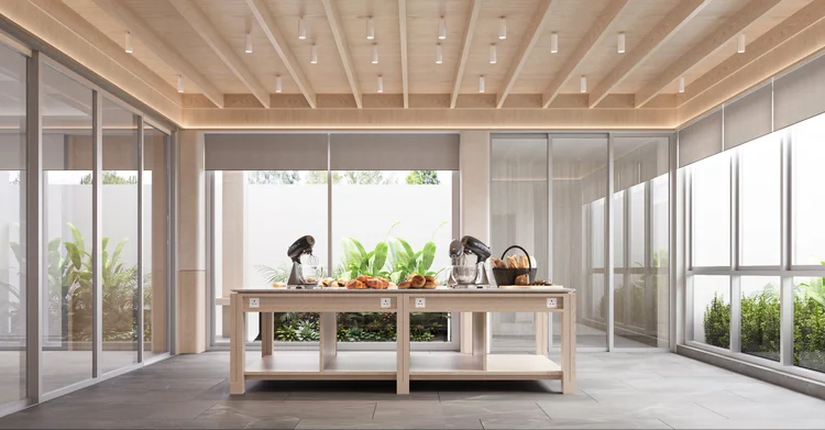 ชั้นล่างถูกออกแบบให้รองรับทั้งการต้อนรับแขกและการสอนทำขนม โดยมีครัวที่ออกแบบ “ขนาดพอดี” สำหรับการทำขนมปัง วัสดุชั้นนี้เน้นความทนทานและดูแลง่าย เพื่อรองรับการใช้งานจริงระยะยาว