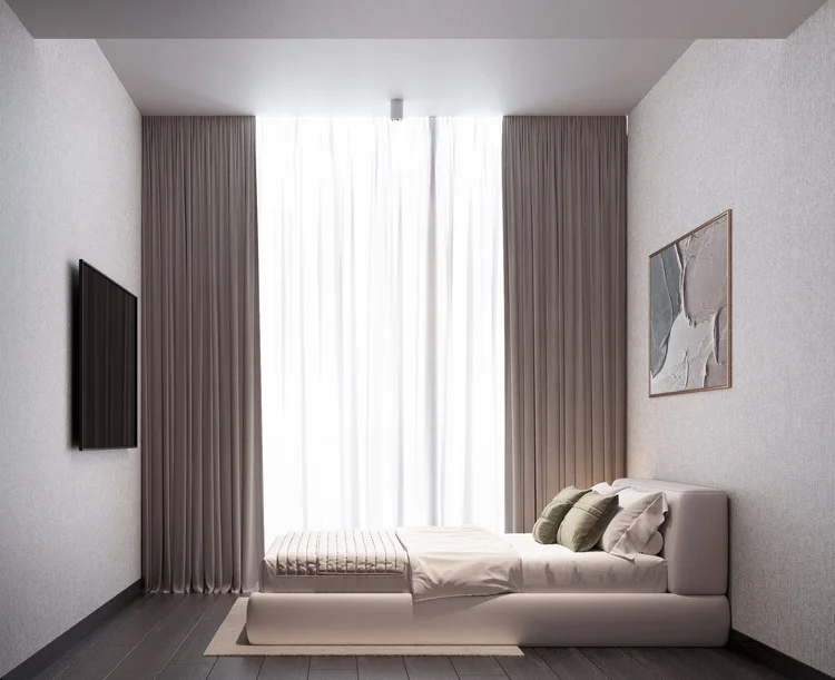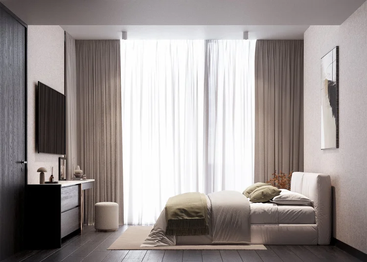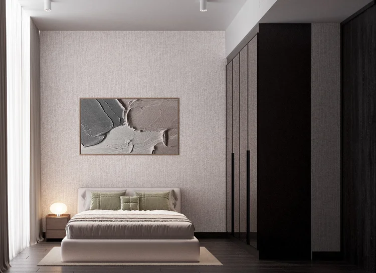 ภายใต้ข้อจำกัดเดิม งานนี้ให้ความสำคัญกับการคัดเลือกวัสดุที่เข้ากับพื้น ผนัง และฝ้าเดิม แต่ยังสร้างมิติใหม่ได้ เช่น การเพิ่มความนุ่มด้วยผิวสัมผัส (texture) โทนอุ่น และรายละเอียดที่ทำให้ห้องดูมีชั้นเชิงมากขึ้น