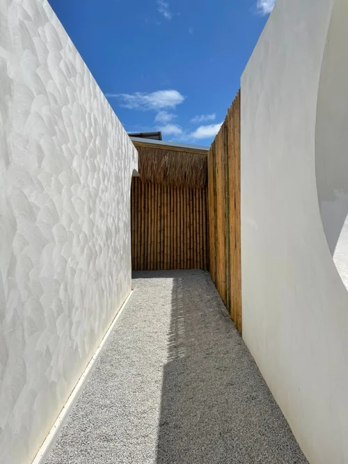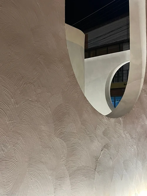 งานนี้ใช้ “รูปทรงพื้นฐาน” เพื่อสร้างเอกลักษณ์: เส้นโค้งที่นุ่ม วงกลมที่เป็นจุดหยุดสายตา และพื้นผิวปูนฉาบลายปาดที่ให้เท็กซ์เจอร์แบบงานมือ เมื่อแสงตกกระทบ จะเกิดมิติที่เปลี่ยนไปตามเวลา โดยแทบไม่ต้องพึ่งของตกแต่งเพิ่มเติม