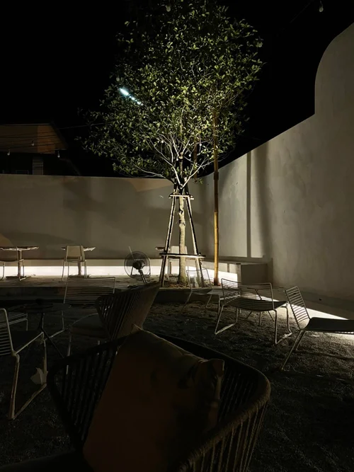 องค์ประกอบที่ทำให้พื้นที่นั่งเล่นดูสบาย คือการรักษาความโล่ง ใช้เฟอร์นิเจอร์เส้นบาง และปล่อยให้ต้นไม้เป็นพระเอกของบรรยากาศ พร้อมแสงซ่อนแนวฐานกำแพงที่ทำให้ตอนกลางคืนพื้นที่ดูนุ่มและมีมิติขึ้นทันที