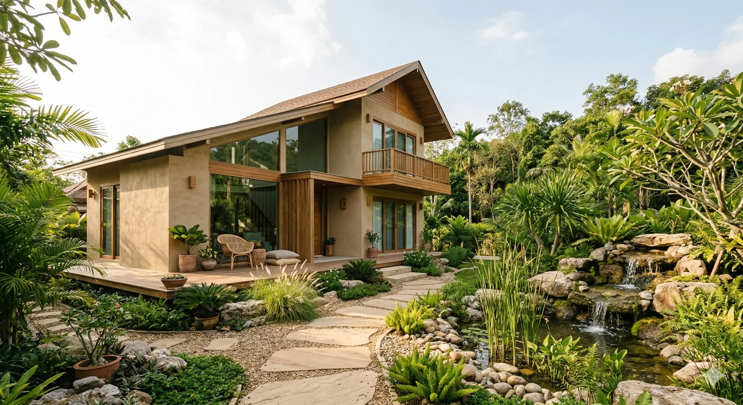 เน้นให้สวนโปร่ง โล่ง เดินสะดวก ไม่รกทึบ วางน้ำหรือสวนน้ำตกในตำแหน่งที่ไม่ทำให้ชื้นสะสม และเลือกต้นไม้ให้ดูแลง่ายเป็นอันดับแรก เพื่อให้สวนดีทั้งมุมมองและการใช้งานจริง